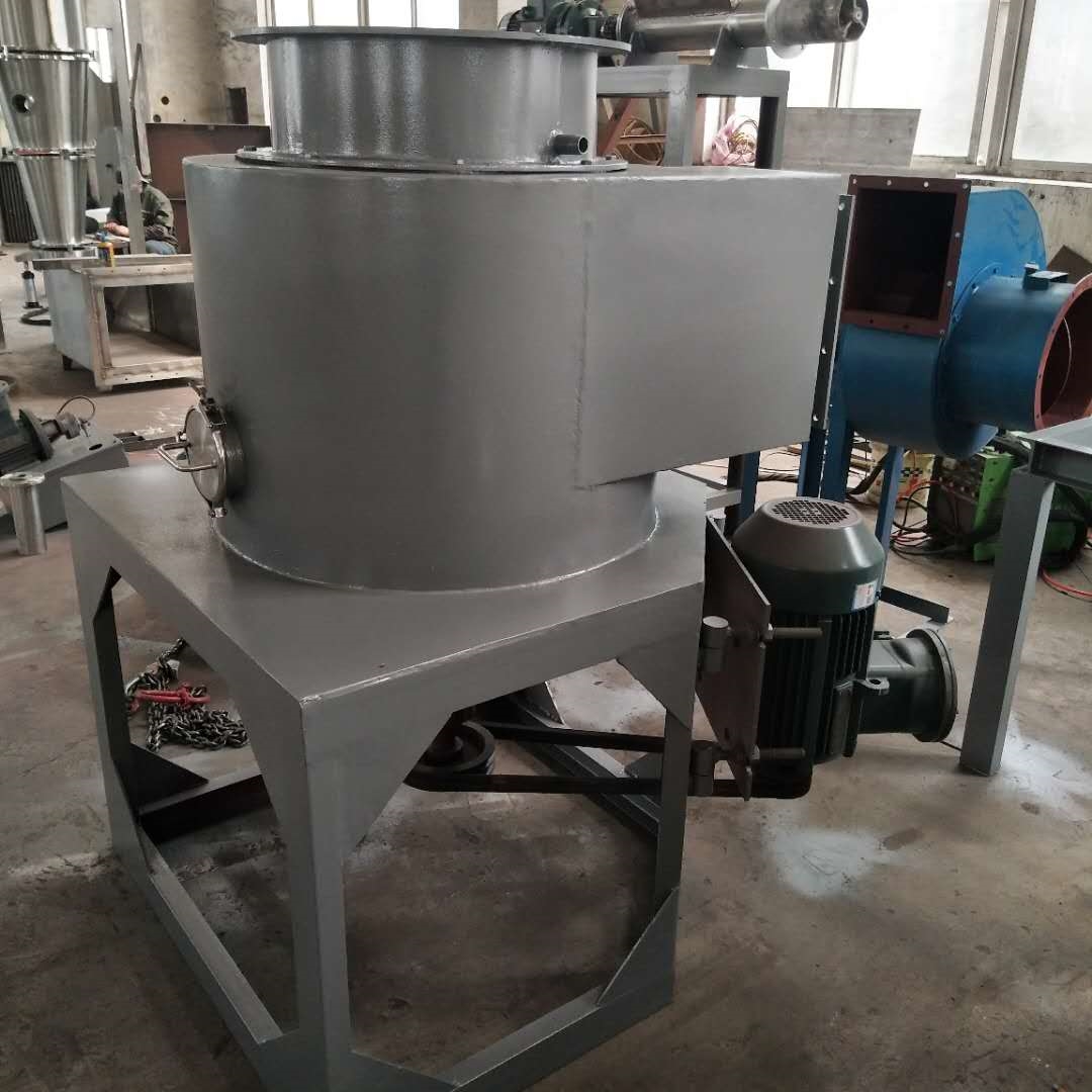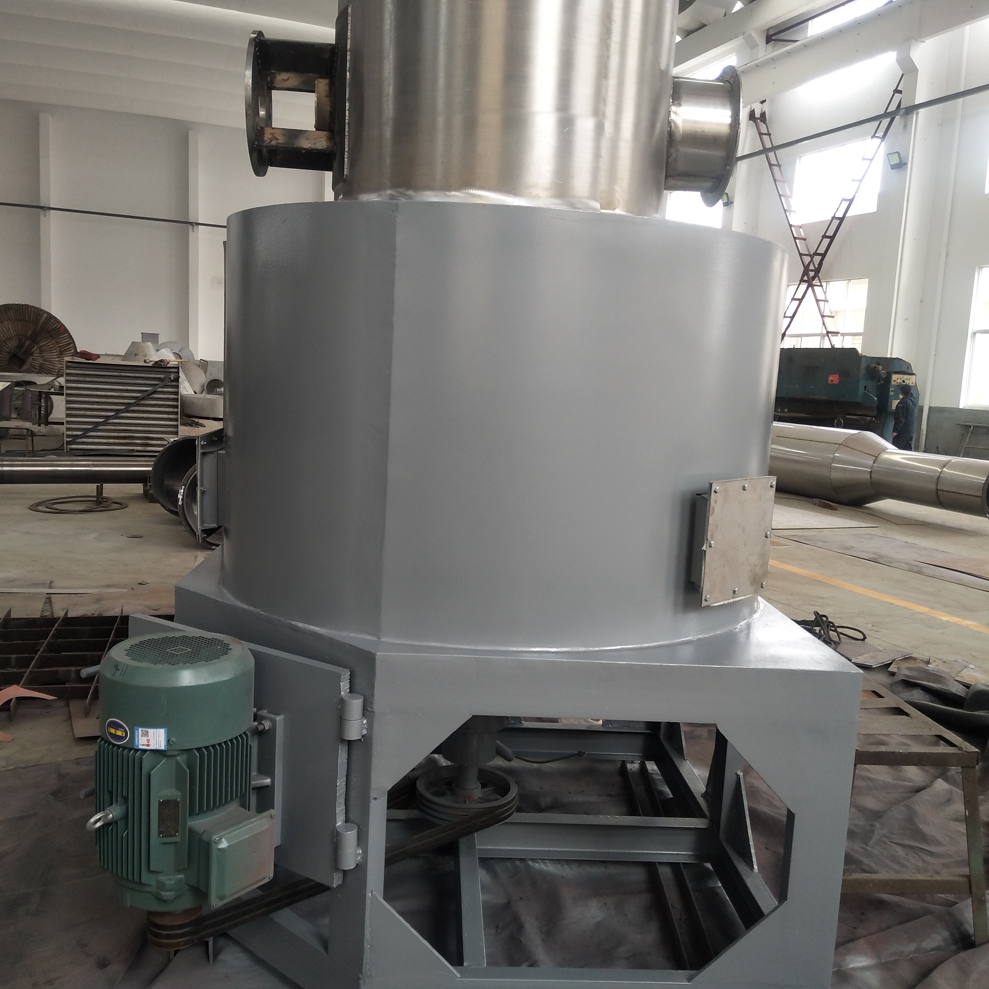熱空氣切線進(jìn)入干燥器底部,在攪拌器帶動(dòng)下形成強(qiáng)有力的旋轉(zhuǎn)風(fēng)場(chǎng)。膏狀物料由螺旋加料器進(jìn)入干燥器內(nèi),在高速旋轉(zhuǎn)攪拌槳的強(qiáng)烈作用下,物料受撞擊、磨擦及剪切力的作用下得到分散,塊狀物料迅速粉碎,與熱空氣充分接觸、受熱、干燥。脫水后的干物料隨熱氣流上升,分級(jí)環(huán)將大顆粒截留,小顆粒從環(huán)中心排出干燥器外,由旋風(fēng)分離器和除塵器回收,未干透或大塊物料受離心力作用甩向器壁,重新落到底部被粉碎干燥。
