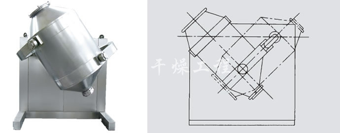 裝料的筒體在主動軸的帶動下,作周而復(fù)始的平移、轉(zhuǎn)動和翻滾等復(fù)合運動,促使物料沿著筒體作三向復(fù)臺運動,從而實現(xiàn)多種物料的互相流動、擴(kuò)散、積聚、摻雜.以達(dá)到均勻混合的目的。
